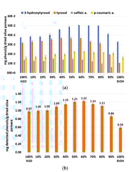 After this first screening with the Folin–Ciocalteu spectrophotometric test, a second screening by UPLC/DAD was performed under the same conditions but only at 50 °C. As can be seen in Figure 7a, 3-hydroxytyrsol and p-coumaric acid follow the same trend as the TPC results while tyrosol and caffeic acid exhibit different behavior depending on the solvent ratios. The sum of these quantified phenols shown in Figure 7b follows the same trend as that presented by the TPC results. This also corroborates that the 60:40 EtOH/H2O mixture provides the best solubility for the target phenolic compounds followed by the 50:50 ethanol/water mixture.