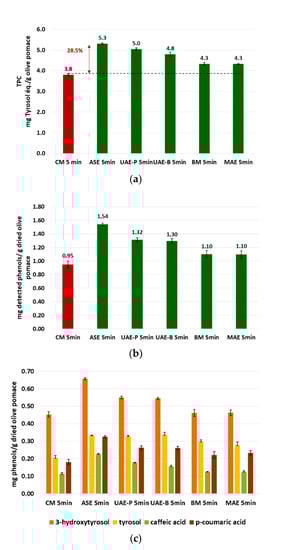 Figure 8a shows that the phenolic extract recovered using ASE presents the highest TPC value (5.31 ± 0.04 mg TE/g DOP), followed by UAE, which reveals higher levels of the probe system (5.04 ± 0.06 mg TE/g DOP) compared to the bath system (4.80 ± 0.11 mg TE/g DOP). The lowest extraction yields correspond to BM (4.32 ± 0.70 mg TE/g DOP) and MAE techniques (4.33 ± 0.02 mg TE/g DOP) with almost identical results (Figure 8a).