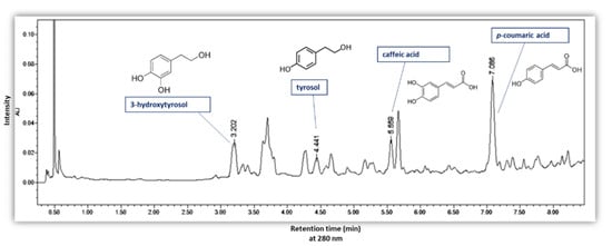 The results of TPC in the different extracts were perfectly confirmed by UPLC analysis (Figure 8b,c). In Figure 9, an UPLC chromatogram of phenolic compounds from olive pomace powder extracted by ASE is presented. Figure 8b presents the sum of the four phenolic compounds quantified by UPLC, detailed in Figure 8c. The results show that the sum of phenols detected by UPLC follows exactly the same trend as TPC. As shown in Figure 8c, 3-hydroxytyrosol has the highest concentration, ranging from (45.2 ± 1.4) 10−2 to (65.7 ± 0.6) 10−2 mg HT/g DOP, followed by tyrosol with (20.3 ± 1.4) 10−2 to (33.2 ± 0.2) 10−2 mg TY/ g DOP and p-coumaric acid with values between (18.0 ± 1.4) 10−2 and (32.5 ± 0.6) 10−2 mg p-CA/g DOP. The lowest concentration was detected for caffeic acid as (12.0 ± 0.8) 10−2 to (22.4 ± 0.5) 10−2 mg CA/g DOP.