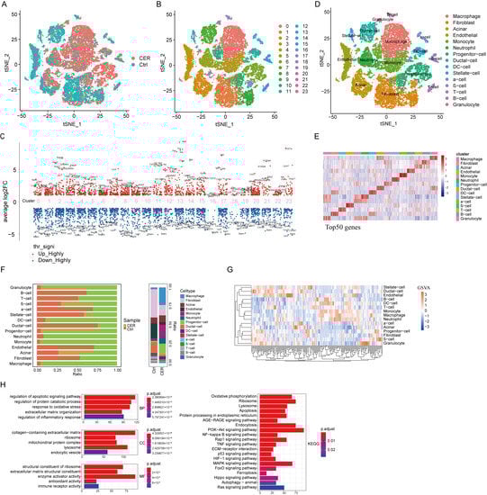 Overview of the single-cell transcriptional profiling of pancreatic cells. (A) tSNE visualization of the CER and control samples. (B) tSNE visualization of 24 cell clusters. (C) Marker genes of the 24 cell clusters. (D) tSNE visualization of macrophages, fibroblasts, acinar cells, endothelials, monocytes, neutrophils, progenitor cells, ductal cells, DC-cells, stellate cells, α-cells, β-cells, T cells, B cells, and granulocytes. (E) Heatmap visualization of the top 50 genes of 15 cell types. (F) The distribution of cells derived from different cell types and different sample origins. (G) GSVA analysis in 15 cell types. (H) GO and KEGG enrichment analysis for CER and the control.