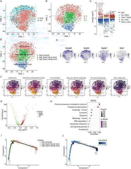 Single-cell RNA-Seq analysis reveals biological characteristics of acinar cells. (A) tSNE visualization of acinar cells from CER and the control samples. (B) tSNE visualization of three cell subclusters. (C) Marker genes of three cell subclusters. (D) tSNE visualization of Amy2a/bhigh, Sqstm1high and Sox4low and Sqstm1high and Sox4high acinar cells. (E) The expression of marker genes in tSNE visualization. (F) The AUCell package was used to calculate the AUCell score. (G) The volcano map shows the differential gene profiling expression. (H) The bubble chart of KEGG pathway enrichment analysis. (I,J) Trajectory analysis of Amy2a/bhigh, Sqstm1high and Sox4low and Sqstm1high and Sox4high acinar cells using Monocle2.