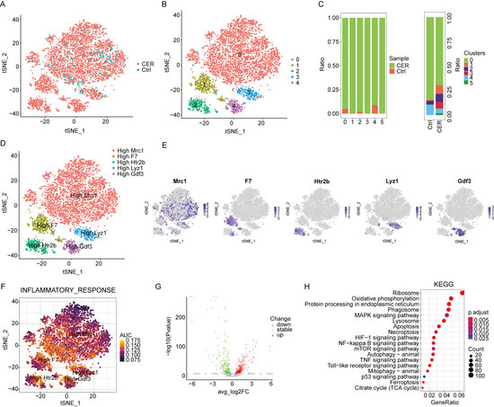 Single-cell RNA-Seq analysis reveals biological characterization of macrophages. (A) tSNE visualization of macrophages from CER and the control samples. (B) tSNE visualization of five cell subclusters. (C) The distribution of cells derived from different cell clusters and different sample origins. (D) tSNE visualization of Mrc1high, F7high, Htr2bhigh, Lyz1high, and Gdf3high macrophages. (E) The expression of marker genes in tSNE visualization. (F) The AUCell package was used to calculate the AUCell score. (G) The volcano map shows the differential gene profiling expression. (H) The bubble chart of the KEGG pathway enrichment analysis.