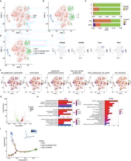 Single-cell RNA-Seq analysis reveals biological characterization of neutrophil. (A) tSNE visualization of neutrophils from CER and the control samples. (B) tSNE visualization of three cell subclusters. (C) The distribution of cells derived from different cell clusters and different sample origins. (D) tSNE visualization of Fcna and Ifnb1high, S100a8/9high, and “other” neutrophils. (E) The expression of marker genes in tSNE visualization. (F) The AUCell package was used to calculate the AUCell score. (G) The volcano map shows the differential gene profiling expression. (H) The bar graph of the KEGG pathway enrichment analysis. (I) Trajectory analysis of Fcna and Ifnb1high, S100a8/9high, and “other” neutrophils using Monocle2.