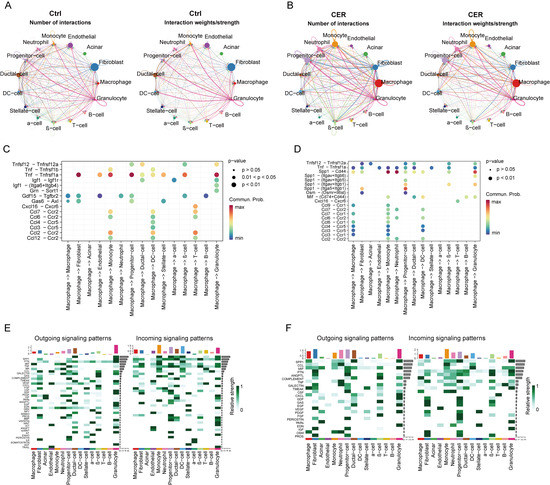 Single-cell transcriptional analysis reveals the cell–cell crosstalk network. (A,B) Analysis of the number of interactions and interaction strength among different cell types in the control sample and CER sample. (B) Analysis of the number of interactions and interaction strength among different cell types in the CER sample. (C,D) Identification of signaling by comparing the communication probabilities mediated by ligand–receptor pairs from macrophages to other cell types in the control sample and CER sample. (E,F) Overview of the outgoing signaling and incoming signaling in CER and the control sample.
