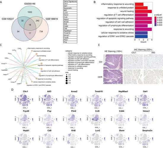 A Venn diagram was produced to depict the overlap between differentially expressed genes from the GSE188819, GSE65146, and GSE109227 datasets. AP-specific gene signatures (Clic1, Sat1, Serpina3n, Atf3, Lcn2, Osmr, Ccl9, Hspb1, Anxa2, Krt8, Cd44, Cd9, Hsp90aa1, Tmsb10, Hmox1, Fxyd5, Plin2, Pnp) were found (Figure 8A). These genes were significantly enriched (p. adjust < 0.05) in the genes of 10 GO pathways such as inflammatory response to wounding, response to unfolded protein, wounding healing, regulation of the apoptotic signaling pathway, and cellular response to oxidative stress (Figure 8B,C). We also depict the expression of gene signature in tSNE visualization. Clic1, Atf3, Anxa2, Tmsb10, and Sat1 were expressed in various cell subtypes, while other genes were expressed in only a few cell types (Figure 8D). Immunohistochemical results showed that the expression of Clic1 and Atf3 increased in AP (Figure 8E). This exploratory AP-specific gene signature needs further validation and may potentially help to guide our future research directions.