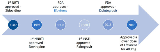 The Food and Drug Administration (FDA) authorized efavirenz on 7 June 1998, with dose of 600 mg orally once-daily (200 mg × 3 capsules, once-daily) for the treatment of HIV infection, and in the European Union in 1999. On 17 February 2016, FDA gave its approval for the generic tablet formulation to Mylan Pharmaceuticals. After getting WHO clearance, Thailand’s Government Pharmaceutical Organization (GPO) declared that it would begin manufacturing efavirenz in late 2018. Today, this drug is registered on the World Health Organization’s (WHO) list of essential medicines for priority diseases [2]. Efavirenz was one of the first acquired immunodeficiency syndrome (AIDS) medications to be authorized for once-daily use. Patients formerly required three 200 mg efavirenz capsules daily, which was later updated to a 600 mg tablet that only required one tablet per day [3,4]. However, in 2001, when given 600 mg once daily, plasma efavirenz concentrations were linked not only to poor HIV suppression but also to toxicity [5]. Numerous investigations followed this association and discovered that a high efavirenz concentration was linked to unfavorable occurrences such as neuropsychiatric symptoms and poor liver function [6,7]. Because of its tolerance profile and the discovery of integrase inhibitors, efavirenz is no longer regarded as a recommended medication in developed countries. It is now referred to as an alternative therapy option [8,9].