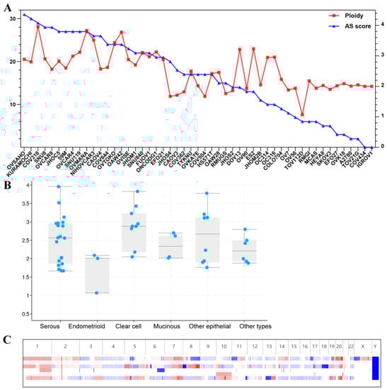 Figure 1. Ploidy and aneuploid score of 51 ovarian cancer cell lines from the CCLE. (A): Ploidy and aneuploid score of 51 ovarian cancer cell lines from the CCLE. The aneuploid score and ploidy value are obtained from cBioPortal on the basis of chromosome copy variations and ABSOLUTE estimation. (B): Comparison analysis of the ploidy value among different histological types (P = 0.138). Other epithelial: cell lines from cystadenocarcinoma type or adenocarcinoma without clear types; Other types: cell lines from granulosa cell tumor of mixed ovarian carcinoma. (C): Copy number variations of representative samples of diploid and aneuploid cell lines. Terms from top to bottom are COV318 (AS = 29, ploidy value = 3.96); COV434 (AS = 0, ploidy value = 2.00); KURAMOCHI (AS = 30, ploidy value = 2.80); A2780 (AS = 2, ploidy value = 2.01); TOV21G (AS = 2, ploidy = 2.05) and OVSAHO (AS = 31, ploidy value = 2.89).