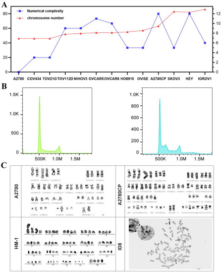 Ovarian cancer is the major cause of death among gynecological cancers. With an insidious onset and rapid progression, approximately 75% of ovarian cancer patients are already at an advanced stage when diagnosed, with less than a 30% five-year survival rate [1,2]. Nearly 80% of ovarian cancers undergo cancer recurrence and acquire chemoresistance, with a low progression-free survival of less than one year for recurrent populations using platinum-based chemotherapy [3,4]. As a hallmark of cancer, approximately 75% of solid tumors show aneuploidy and chromosomal instability (CIN), with a complex and heterogeneous karyotypic landscape [5]. Karyotypic alterations have been considered to contribute to tumor progression and immune editing, shaping the genetic heterogeneity and karyotypic evolution of cancer cells under poor conditions, which directly or indirectly promotes chemoresistance in cancer [6,7,8,9,10]. Focusing on the ploidy status and karyotypic alteration might provide inspiration for overcoming chemoresistance and exploring potentially new therapeutic targets in ovarian cancer.