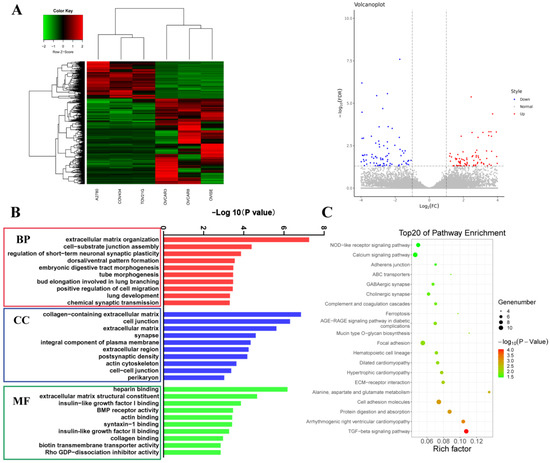 Figure 3. Identification and functional analysis of the differentially expressed genes. (A): Heat map and volcano plot of the differentially expressed genes (DEGs) among diploid cell lines versus aneuploid cell lines. (B): Gene Ontology summary of DEGs for biological process categories (BP), cell component categories (CC) and molecular function categories (MF). (C): Kyoto Encyclopedia of Genes and Genomes summary of DEGs.