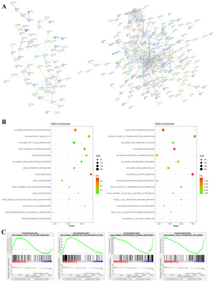 A protein–protein interaction (PPI) enrichment analysis showed some interactions among the downregulated and upregulated genes in aneuploid cell lines (Figure 4A). A gene set enrichment analysis (GSEA) showed that genes downregulated in the aneuploid group were mainly enriched in metabolism-related gene sets, such as “ribosome”, “hallmark oxidative phosphorylation”, “hallmark fatty acid metabolism” and “KEGG arginine and proline metabolism” (Figure 4B,C). Genes upregulated in the aneuploid group were mainly enriched in immune-related pathways, such as the “KEGG NOD-like receptor signaling pathway”, “hallmark interferon gamma response”, “KEGG cytokine-cytokine receptor interaction”, “hallmark inflammatory response”, and “hallmark TNFA signaling via NFκB” (Figure 4B,C).