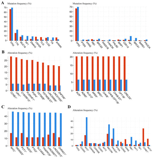 Figure 6. Comparison of genetic alterations between near-euploid and highly-aneuploid ovarian cancer patients. (A) Mutation frequency in highly-aneuploid (high-aneuploid score) group and near-euploid (low-aneuploid score) group. Left panel: Gene mutations with the highest frequency in any group; Right panel: Common mutations in serous ovarian cancer. (Blue: euploid group; red: aneuploid group). (B) Copy number alterations enriched in the highly-aneuploid group. Left: amplification; right: deletion. (C) Copy number alterations enriched in the near-euploid group. (D) Copy number alterations of genes frequently altered in serous ovarian cancer.