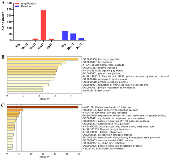 To better understand the association between potential crucial chromosome alterations and ploidy status in ovarian cancer patients, we analyzed the genomic alteration between euploid and aneuploid ovarian cancer patients. A total of 582 ovarian cancer patients were included and ranked by aneuploid score from highest to lowest, which partially reflects the aneuploid level [33]. The top quarter were categorized as a highly-aneuploid group and the bottom quarter were categorized as a near-euploid group, similar to previous classifications of cell lines [32]. The genomic alterations were analyzed between the highly aneuploid and near-euploid group using the cBioPortal online tool. There was no significant difference between the two groups in the frequency of the common mutations in ovarian cancer [20] or the mutations with the highest frequency in any group (Figure 6A). However, the copy number variations (CNV) between the two groups showed a clear difference (Figure 6B,C). The frequency of CNV in frequently altered genes in serous ovarian cancer was also significantly different between the two groups (Figure 6D) [42]. The location of genes with CNV significantly enriched in the highly-aneuploid group showed that these genes are mostly enriched in chromosome 19, regardless of amplifications or deletions (Figure 7A). An enrichment analysis showed that these genes in chromosome 19 were mainly related to the immune function (Figure 7B). All these data showed that the chromosome 19 alteration might be potentially significant for aneuploid ovarian cancer.
