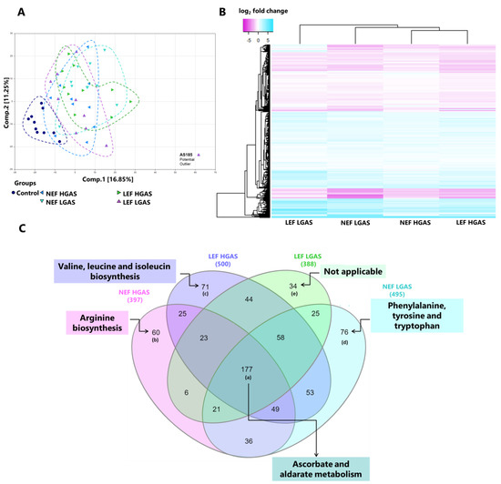 Principal component analysis (PCA) score plot was created using the statistical package programs R (http://cran.r-project.org/, accessed on 13 October 2022) [21]. Interactivenn (http://www.interactivenn.net/index2.html/, accessed on 13 October 2022) [22] was used to generate venn diagrams, Heat mapper (http://www.heatmapper.ca/, accessed on 13 October 2022) [23] to generate heatmaps. Metabolic pathway enrichment analysis and pathway topology analysis were conducted using the MetaboAnalyst 5.0 (https://www.metaboanalyst.ca/home.xhtml, accessed on 13 October 2022) [24] computational platform.