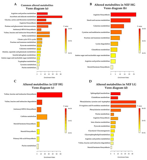 In the next step, we performed enrichment and pathway analyses to attain more mechanistic insights. We found ascorbate and aldarate metabolism, arginine biosynthesis, and arginine and proline metabolism to be the most significantly altered in the All-AS group compared to the controls (Figure 2A). Next, we analyzed the distinctly altered metabolites in each AS subtype separately. Pathway analysis highlighted a remarkable change of arginine biosynthesis, starch, and sucrose metabolism in the NEF HGAS group (Figure 2B). In the LEF HGAS group, the most affected pathways appeared to be the metabolism of valine, leucine and isoleucin (Figure 2C). Phenylalanine, tyrosine, and tryptophan biosynthesis was predominantly deranged in the NEF LGAS group (Figure 2D). No pathways were significantly enriched in the LEF LGAS group. This analysis indicates prominent changes in amino acids (AAs) metabolism in AS patients. This was associated with increased nitrogen load. When comparing the All-AS group to controls, numerous compounds involved in nitrogen balance, such as circulating urea, and polyamine levels were found to be significantly elevated (Supplymentary Figure S1), but no differences were found between the subgroups (Supplymentary Figure S1C, Supplymentary Excel S2). Additionally, numerous amino acids were significantly reduced in the All-AS group vs. controls (Supplymentary Figure S2) with no differences between the subtypes (Supplymentary Figure S2C, Supplymentary Excel S2).