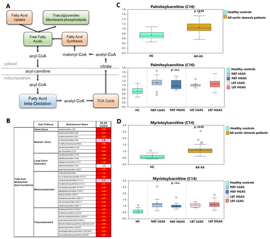 Altered metabolism of fatty acids. (A) Illustration of fatty acid uptake to the mitochondria by transfer of acyl-residues to acylcarnitine. (B) List of altered aclycarnitines between AS patients and healthy controls (significantly regulated molecules marked in red). Values marked in light red indicate a trend towards statistical significance (0.05 < p < 0.10). Non-colored values are not significantly different for that comparison. Numbers indicate x-fold increase in concentration. * p ≤ 0.05. (C,D) Palmitoylcarnitine (C16) and myristoylcarnitine (C14) as examples between All-AS vs. controls as well as the different AS subgroups. On each box, the black cross indicates the mean value, the borders and segmentation indicate limits of upper/lower quartile and median values. Outliers are plotted as circles. n.s.: not significant between AS subgroups.