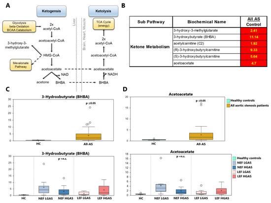 Ketone bodies in AS and healthy controls. (A) Illustration of ketone body utilization for energy production via TCA cycle. (B) List of significantly altered ketone bodies between All-AS group and controls (significantly regulated molecules marked in red, numbers indicate x-fold increase in concentration). (C,D) 3-Hydroxbutyrate (BHBA) and acetoacetate as examples between All-AS vs. controls as well as the different AS subgroups. On each box, the black cross indicates the mean value, the borders and segmentation indicate limits of upper/lower quartile and median values. Outliers are plotted as circles. n.s.: not significant between AS subgroups.