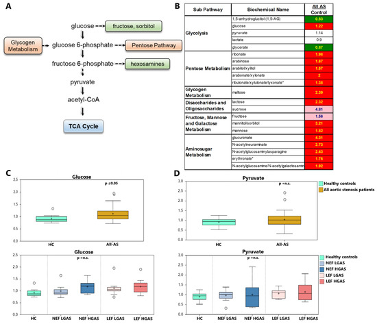 Sugar metabolites in AS and healthy controls. (A) Illustration of glucose utilization pathways for energy production via TCA cycle including glycolysis, pentose phosphate pathway (PPP), and hexosamine biosynthetic pathway. (B) List of altered metabolites. Significantly up- and downregulated molecules are marked in red and green, respectively. Values marked in light red indicate a trend towards statistical significance (0.05 < p < 0.10). Non-colored values are not significantly different for that comparison. Numbers indicate x-fold increase/decrease in concentration. * p ≤ 0.05. (C) Glucose as an example between All-AS vs. controls as well as the different AS subgroups. (D) Pyruvate as an example between All-AS vs. controls as well as the different AS subgroups. On each box, the black cross indicates the mean value, the borders and segmentation indicate limits of upper/lower quartile and median values. Outliers are plotted as circles. n.s.: not significant between AS subgroups.