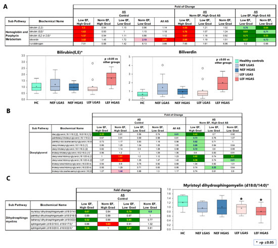Metabolites with different serum levels between AS subgroups. (A) List of altered hemoglobin related metabolites. Bilirubin and biliverdin are illustrated as examples. (B) List of altered diacylglycerols (DAGs) in AS patients. (C) List of altered dihydrosphingomyelins (DHSMs) in AS subgroups. Myristoyl dihydrosphingomyelin is illustrated as an example. Significantly, up- and downregulated molecules are marked in red and green, respectively. Values marked in light red and light green indicate a trend towards statistical significance (0.05 < p < 0.10). Non-colored values are not significantly different for that comparison. Numbers indicate x-fold increase/decrease in concentration. On each box, the black cross indicates the mean value, the borders and segmentation indicate limits of upper/lower quartile and median values. Outliers are plotted as circles. Asterix (*) indicates p ≤ 0.05 between the annotated group and the control group.