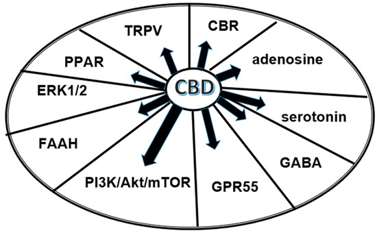 Besides effects on well-established cannabinoid receptors, CBD also affects many receptors in other receptor systems (Figure 1). Hence, it has been described that CBD acts as an agonist on serotonergic receptor 5-HT1A, a partial agonist on subtype 5-HT2A, and a non-competitive antagonist on subtype 5-HT3A. It activates the adenosine receptors A1, GABAergic GABAA receptors, and the nuclear receptor PPARγ. CBD is an inverse agonist for the G-protein-coupled receptors 3, 6, and 12 (GPR3, GPR6, and GPR12) [21,52]. Furthermore, it stimulates α1 and α1β subunits of the glycine receptors and has a partially agonistic effect on dopamine D2 receptors. It has agonistic activity on the ionotropic receptors TPPA1, TRPV1, TRPV2, TRPV3, TRPV4, and TRPV8 [21,51]. It has been found that CBD also binds to the μ-opioid receptor (MOR) and the δ-opioid receptor (DOR) [53]. There is also developing discussion about possible non-receptor mechanisms such as an increase in anandamide levels (which is thought to be in context with the CBD inhibitory effect on the inactivating hydrolase FAAH) [51,54,55,56,57,58] or non-selective inhibition of the voltage-dependent potassium channels [57].