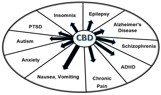Besides these three indications, available medical reports gradually confirm the potential therapeutic effects of CBD for many other purposes, including anorexia [29], cancer [71], ulcerative colitis [79], dementia [80], depression [72,73,81], dyslipidemia [78], schizophrenia [78,82], sleep disorders [29,72], substance abuse [73], spasticity in multiple sclerosis [29], autism and associated disorders [83,84], attention deficit/hyperactivity disorder (ADHD), posttraumatic stress disorder (PTSD) [85], etc. The most promising indications are shown in Figure 2.
