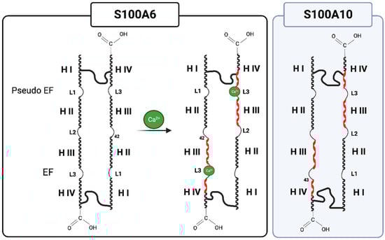 S100 (ex. S100A6) monomers, typically containing two EF-hand motifs consisting of a short helix, loop, and long helix, undergo a conformation change upon Ca2+ binding, exposing a hydrophobic patch in helix III and IV to bind target proteins (red helix). S100A10 resembles the Ca2+-loaded S100 protein, suggesting that it exists in an active, Ca2+-independent conformation. Created with “Biorender.com (accessed on 5 September 2023)”.