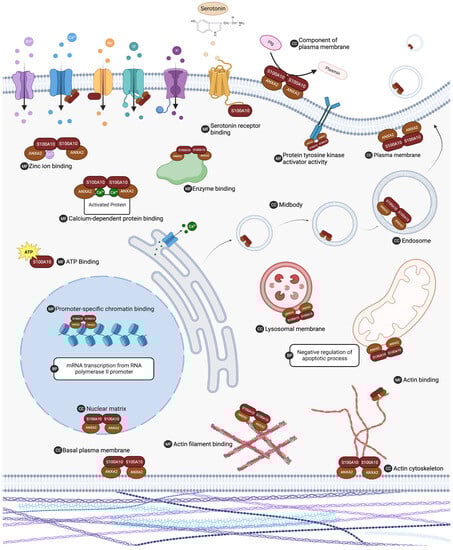 The list of S100A10 interacting proteins was subjected to gene ontology analysis in DAVID 7.0 to characterize putative biological activity. Gene ontology analysis indicated that S100A10 interacting proteins are ubiquitous in the cell and are involved in many important processes. Biological processes (BP), molecular functions (MF), and cellular component (CC) ontology results with a p value < 0.05 and FDR < 0.1 are summarized. ANXA2 (annexin A2). Created with “Biorender.com (accessed on 6 August 2023)”.