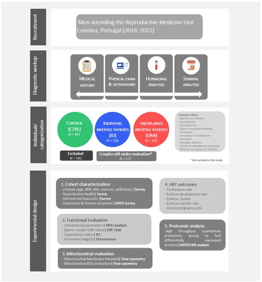 Individuals, undergoing routine seminal analysis for fertility treatments, were recruited at the Reproductive Medicine Unit of the Centro Hospitalar e Universitário de Coimbra (CHUC; Coimbra, Portugal) from July 2018 to July 2022. All the individuals in this study have accepted to participate by signing an informed consent form. The medical history, physical examination, hormonal and seminal analysis were part of the diagnostic workup (Figure 1). All procedures were approved by the ethics committee of the CHUC (CHUC-098-18).