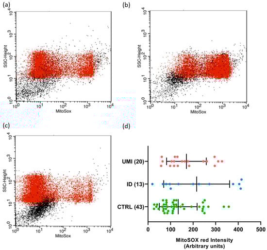 Sperm mitochondrial superoxide levels. Flow cytometry dot-plot chart of CTRL (a), ID (b), and (c) UMI sperm cells labelled with MitoSOX (red dots). (d) MitoSOX fluorescence intensity (arbitrary units) on the three study groups. Data are presented as mean ± SEM and the number of experiments is indicated in brackets. CTRL—healthy men, ID—idiopathic infertile men, UMI—unexplained infertile men.