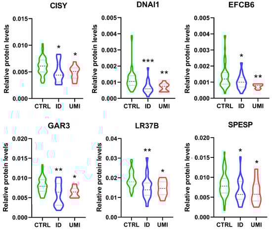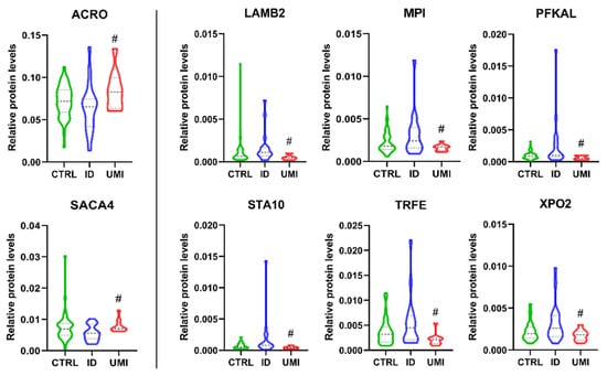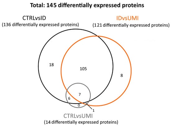 The proteomic analysis included 79 samples: 50 CTRL, 19 ID and 10 UMI (Supplementary File S1). In these samples, 295 proteins were found to be differentially expressed (p < 0.05). Proteins where only one peptide was detected and the coefficient of variation on the technical replicates was higher than 20% were excluded, leaving 145 proteins for subsequent analysis. These proteins were then distributed in three protein sets: (1) proteins differentially expressed between CTRL and ID (CTRLvsID), containing 136 proteins; (2) proteins differentially expressed between CTRL and UMI (CTRLvsUMI), containing 14 proteins, and proteins differentially expressed between ID and UMI (UMIvsID), containing 121 proteins (Figure 5).