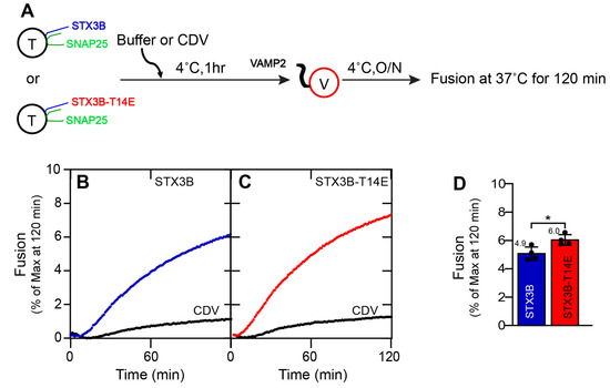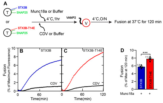 We employed a reconstituted in vitro fusion system to probe the effects of syntaxin 3B with and without a T14E phosphomimetic mutation on membrane fusion. To this end, recombinant t-SNARE proteins were produced by co-expressing full-length syntaxin3B (or T14E) and His tagged-SNAP25b [3]. Full-length VAMP2-His6 was produced to perform the role of the v-SNARE. Retinal t-SNAREs, syntaxin3B/SNAP25b or syntaxin3B-T14E/SNAP25b (acceptor), and VAMP2 (donor) were reconstituted into liposomes at 1:100 surface densities [44,52]. Syntaxin3B/SNAP25b-containing proteoliposomes were mixed with VAMP2-containing proteoliposomes in a 1:1 ratio at the concentration of 1.5 µM for each SNARE. Fusion was measured using a well-characterized fluorescence resonance energy transfer (FRET) lipid mixing assay between t-SNARE and v-SNARE-containing liposomes (Figure 1A) [25]. A soluble version of VAMP2 (CDV) served as a negative control (Figure 1B,C) [43].