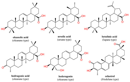 Chemical structure of some PTs from oleanane, ursane, lupane, and friedelane types as NRs modulators. Atoms were colored by element.