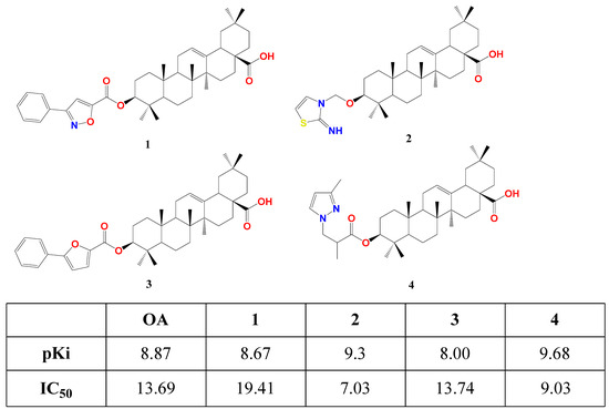 Structure of 3β esters of OA derivatives 1–4 showing their theoretical (pKi) and experimental effect (IC50) on FXR. Atoms were colored by element [77].
