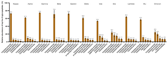 Additionally, we analyzed the top five O-glycopeptides across all variants and determined that the most abundant O-glycan (H1N1A2) was observed on amino acid residue T323/S325 except in omicron (Figure 4). The omicron variant possesses this abundant glycan in position T315/S316. The disialylated core 1 O-glycan has been reported to be the most abundant in the wild type of SARS-CoV-2 S protein in many studies [46,72]. The single levels of this glycan varied between 75.0% and 53.4% relative abundance in almost all the evaluated variants (Figure 4). Conversely, the eta and omicron variants presented considerably lower relative abundances of this glycan H1N1A2 with 23.7% and 24.5%, respectively (Figure 4). In this case, both variants showed a uniform O-glycan distribution. This observation may be due to the increased number of O-glycosylation sites present in both variants. The relative abundances are spread across the multiple O-glycosylated sites.