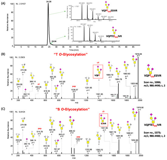 Unlike N-glycosylation, the motifs observed for O-glycosylation are more complicated. O-glycoproteomic analysis is challenging due to differences in glycoforms attached to a glycosylation site and the site occupancy [27,54]. Therefore, the digestion method and instrument methodology employed have a significant impact on the number of identified O-glycosylation sites and the quality of MS/MS spectra that will be generated [69,92]. Another difficulty associated with the study of O-glycosites using glycoproteomic analysis is the fact that several of these sites are relatively close to one another. Thus, often the final glycopeptides contain more than one glycosylation site occupied with the same or different glycans. A clear example is the heavily glycosylated T323/S325 in the S-protein of SARS-CoV-2, which has posed a significant challenge in deciphering the specific localization of glycosylation in studies conducted by many groups [27,29]. Studies have shown that HCD does not provide a confident assignment of site localization for multiply glycosylated peptides [59,69,93]. To overcome this problem, coupled with double digestion using tryptic and IMPa digestion, we employed an HCD–EThcD pair dissociation method for selective backbone fragmentation to aid the confident assignment of O-linked glycans on adjacent S and T present on the same backbone. In this technique, HCD is first used to generate a spectrum that facilitates accurate identification of peptide backbone fragments without localization of the glycan. However, the precursor mass in the HCD spectrum corresponds to a combination of the peptide and the O-glycans. Subsequently, the paired EThcD spectrum allows for the site-specific localization of O-glycosylation even in multiply glycosylated peptides [59,93,94]. The reporter ions produced by HCD are systematically merged with the signature fragments necessary for O-glycosite localization generated by EThCD in a sequential manner [95]. The utilization of this integrated fragmentation technique has the capability to generate a broader range of fragment ions, hence enhancing the analysis of site-specific glycosylation. Moreover, the resulting spectra exhibit a high level of quality [96]. With this novel approach, we have been able to show that both T323 and S325 are O-glycosylated. Figure 7A shows the EICs of the positional isomers of the O-glycopeptides (VQPT323ESIVR) + H1N1A2 and (VQPTES325IVR) + H1N1A2. Figure 7B shows the mass spectra of the O-glycopeptide (VQPT323ESIVR) + H1N1A2. The C4 fragment “VQPT323 + H1N1A2” with an m/z value of 1391.65 shows that T323 is occupied with the O-glycan H1N1A2, and a z4 fragment with the rest of the peptide backbone. Figure 7C shows the mass spectra of the O-glycopeptide (VQPTES325IVR) + H1N1A2. In this case, the fragment z5 “ES325IVR + H1N1A2” with an m/z value of 1550.65 shows that S325 is occupied with the O-glycan H1N1A2. Although our instrumentation generated MS/MS spectra for qualitative identification of these isobaric O-glycopeptide ions, we were unable to obtain a good resolution of the peaks with the employed analytical technique. We have also shown the same peptide “VQPTESIVR” that is doubly glycosylated with different glycans confidently assigned to the glycosylation sites T323 and S325, as shown in Supplementary Figure S15. The z5 fragment confirms the linkage of H1N2A1 to S325, while the c6 fragment shows the linkage of H1N1 to T323 and H1N2A1 to S325.