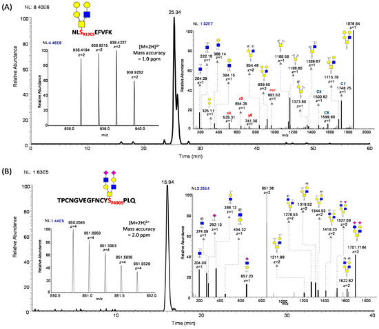 - Cao, L.; Diedrich, J.K.; Kulp, D.W.; Pauthner, M.; He, L.; Park, S.R.; Sok, D.; Su, C.Y.; Delahunty, C.M.; Menis, S.; et al. Global site-specific N-glycosylation analysis of HIV envelope glycoprotein. Nat. Commun. 2017, 8, 14954. [Google Scholar] [CrossRef] [PubMed]