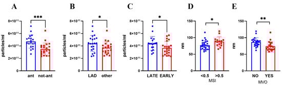 sEVs number (A–C) and size (D,E) were evaluated by NTA after isolation from plasma collected 3–5 days post STEMI. Patients were divided according to (A) STEMI site, (B) culprit lesion artery, (C) presentation time, (D) MSI (low <0.5; high >0.5), (E) MVO presence. Mean ± SD are reported. * p < 0.05; ** p < 0.01; *** p < 0.005. ant: anterior STEMI, non-ant: non-anterior STEMI, LAD: Left anterior descending artery, MVO: microvascular obstruction, MSI: myocardial salvage index.