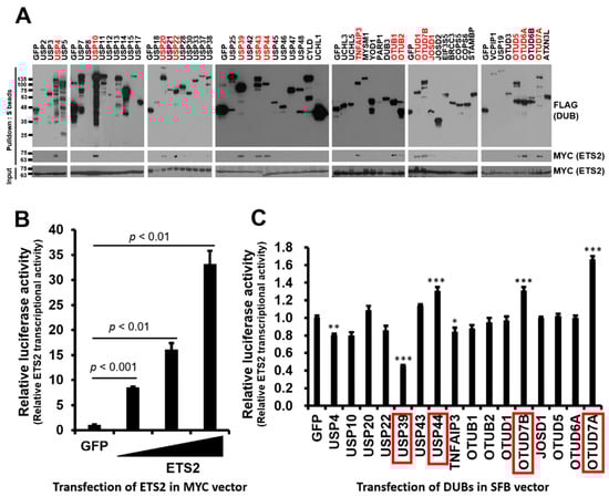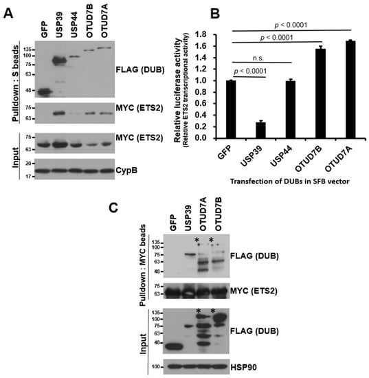 To identify DUBs interacting with ETS2, we conducted binding assays between ETS2 in an MYC-tagged expression vector and DUBs from a human DUB library consisting of 59 DUBs in an SFB-tagged expression vector. We co-transfected HEK293T cells with each SFB-DUB and MYC-ETS2 vectors and pulled down the DUB using S-protein agarose beads. As shown in Figure 1A, sixteen DUBs displayed noticeable interactions with ETS2.