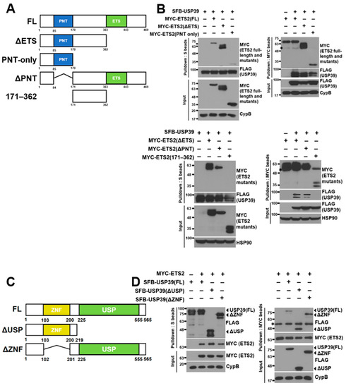 To identify the domains responsible for the interaction between ETS2 and USP39, we created several deletion mutants of ETS2:ΔETS (ETS domain-deleted, aa 1–362), PNT-only (Pointed domain-containing, aa 1–170), ΔPNT (Pointed domain-deleted, aa 1–84 & 171–469) and 171–362 (containing aa 171–362) (Figure 3A). The ETS domain, characterized as a variant of the winged helix–turn–helix motif, is crucial for DNA binding in ETS family transcription factors [21]. The PNT or Pointed domain is responsible for protein–protein interactions, enabling signal transduction mediated by ETS2 [22]. These constructs, along with full-length SFB-USP39, were co-transfected into HEK293T cells, and SFB-USP39 was pulled down using S-protein agarose beads. Figure 3B shows that both full-length ETS2 and three ETS2 mutants, but not 171–362, interacted with USP39. Additionally, we conducted a reverse immunoprecipitation assay by immunoprecipitating ETS2 and its mutants using MYC antibody-conjugated agarose beads. Then, we examined the interaction of SFB-USP39 with these immunoprecipitated proteins. The results demonstrated that USP39 could bind to ETS2 and all its mutants except 171–362. These findings confirm that USP39 binds to the unspecified amino-terminal region of ETS2, and they indicate that the PNT domain is not required for their interaction.