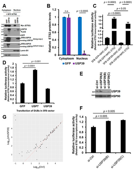 In addition, we silenced endogenous USP39 levels to examine its effect on the transcriptional activity of ETS2. Knockdown of USP39 was efficient using siRNA oligos B and C (Figure 5E), and both were used for luciferase reporter assays. When USP39 levels were silenced, the transcriptional activity of ETS2 significantly increased in both knockdown cells (23% and 27% increase in B and C, respectively) (Figure 5F), which implies that USP39 is necessary for suppressing the transcriptional activity of ETS2.