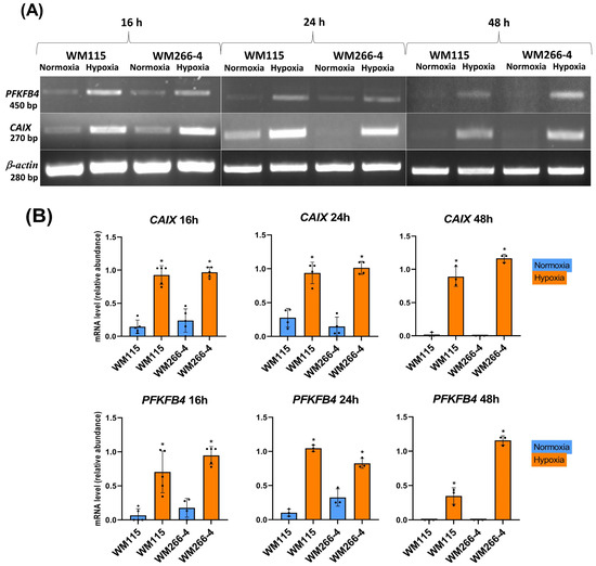 In our studies, the induction of hypoxia in WM115 and WM266-4 melanoma cells during culture was confirmed by increasing the mRNA as well as protein levels of carbonic anhydrase IX, and additionally by increasing the mRNA level of 6-phosphofructo-2-kinase/fructose-2,6-biphosphatase 4 (Figure 1A,B and Figure 2A,B), which was also reported previously by Trojan et al. [44].