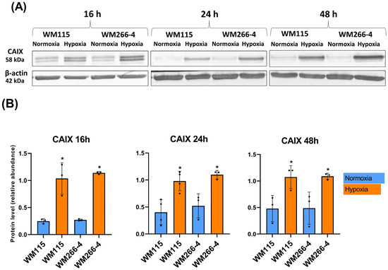 We initially analyzed the response of WM115 and WM266-4 cell lines to low oxygen concentration levels. To confirm the hypoxic condition we have evaluated the expression of carbonic anhydrase IX (CAIX) and phosphofructo-2-kinase/fructose-2,6-biphosphatase 4 (PFKFB4) using RT-PCR (Figure 1A,B). To further confirm our findings we have analyzed CAIX protein levels using Western blot (Figure 2A,B). We have conducted our experiments in consecutive time points (16, 24, 48 h). A hypoxic environment was established at each mentioned time point. The representative results are shown in Figure 1A (RT-PCR) with the following densitometry analysis of obtained bands (Figure 1B), Western blot analysis (Figure 2A), and with the following densitometry analysis of obtained bands (Figure 2B).