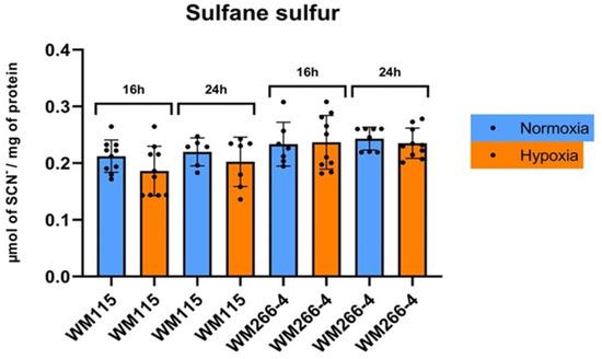 We observed that the level of sulfane sulfur determined in melanoma WM115 and WM266-4 cells after 16 and 24 h of culture under hypoxic conditions was unchanged compared to normoxia (Figure 4). Gao et al. [56] reported that there is a close relationship between sulfane sulfur and hypoxia in living cells and in vivo. However, the overall level of sulfane sulfur is affected by the degree and length of hypoxic stress.