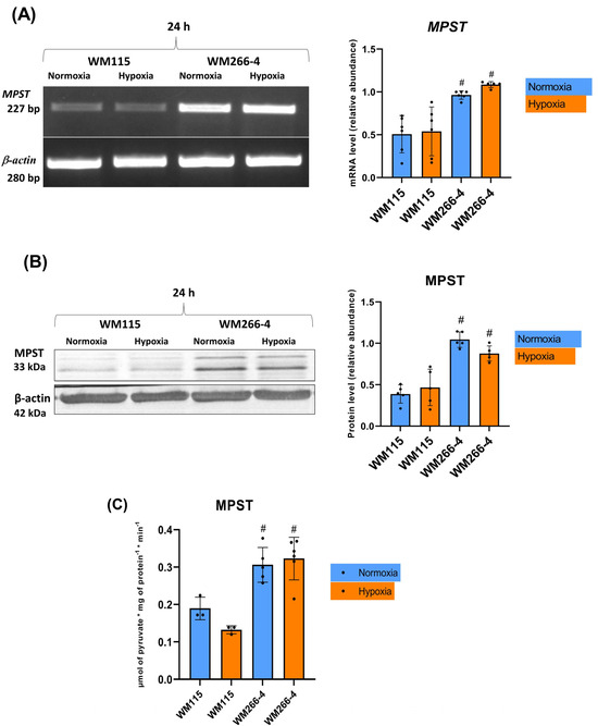 The effect of hypoxia on MPST expression and activity: (A) mRNA level, (B) protein level, and (C) enzymatic activity in human melanoma cell lines (WM115 and WM266-4). Cells were incubated under normoxia and hypoxia for 24 h. Representative results of MPST mRNA (A) and protein (B) gel/blot are shown in Figure 5. Original images of RT-PCR and Western blot results are shown in Supplementary Materials. Quantification of MPST expressions (mRNA level and protein level) was performed via the densitometry analysis of gels (A,B). The results are expressed as mean ± SD. # indicates significant differences between parallel conditions (e.g., WM115 normoxia vs. WM266-4 normoxia; # p ≤ 0.05). Experiments were performed at least three times. Each dot (●) represents an individual measurement.