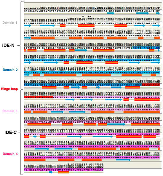 Primary and secondary structure of a human IDE in the monomeric apo form (PDB ID: 2JG4). The amino acids 1–42 and 1012–1019 are unresolved. The sequence background is colored by protein domains: white (domain 1: aa 1–285), blue (domain 2: aa 286–515), pink (domain 3: aa 542–768), magenta (domain 4: aa 769–1019), and red (hinge loop: aa 516–541). IDE-N and IDE-C portions are indicated by braces. Asterisks (*) indicate the catalytic residues. A Kabsch–Sander secondary structure cartoon is reported (blue arrows (β-strands), solid orange cylinders (α-helices), and gray lines (loops); software: Discovery Studio Studio 2017 R2 client, Dassault Systèmes Biovia Corp, San Diego, CA, USA, 2016).