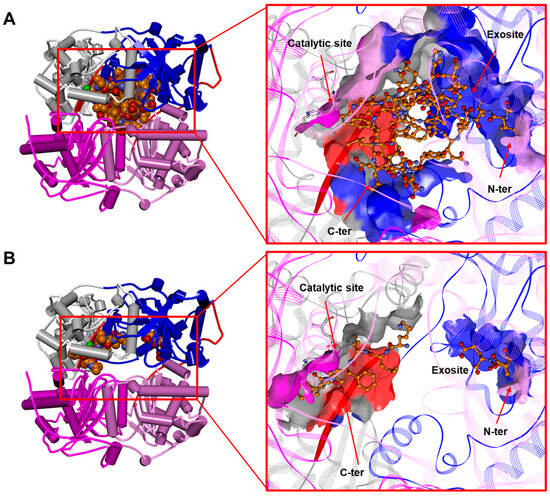 (A) The human IDE in a complex with insulin in dimeric form (PDB ID: 2WBY; for the sake of clarity, only one monomer of the IDE is displayed). (B) The human IDE in a complex with Aβ in dimeric form (1–42; residues 4–15 and 23–42 are unresolved; PDB ID: 2WK3; for the sake of clarity, only one monomer of the IDE is displayed) [138]. Left: overall structure of the complex. The secondary structure is displayed as wide cylinders (α-helices), arrows (beta-sheets), and tubes (coils and turns), and is colored by protein domains: white (domain 1: aa 43–285), blue (domain 2: aa 286–515), pink (domain 3: aa 542–768), magenta (domain 4: aa 769–1016), and red (hinge loop: aa 516–541). The substrates are displayed in CPK and colored orange. Right: close-up view of the substrate binding site. The binding site solvent-accessible surface is displayed and colored by protein domains. The protein is displayed as line ribbons. The β6 strand (aa 137–143) of the IDE is evidenced with a red solid ribbon. The catalytic residues are displayed on the stick and colored by atom type (C: white; N: blue; O: red). The zinc ion is displayed in CPK (scale: 0.7) and colored green. The substrates are displayed in ball and stick and colored by atom type (C: orange; N: blue; O: red). The hydrogen atoms are omitted for the sake of clarity. (Software: Discovery Studio 2017 R2 client; Dassault Systèmes Biovia Corp, San Diego, CA, USA, 2016).