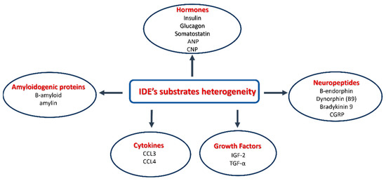 The IDE degrades a wide spectrum of peptides with little or no sequence homology, including β-amyloid (see Section 3.3), amylin, glucagon, somatostatin, insulin-like growth factor-2 (IGF-2), dynorphins, bradykinin, and atrial natriuretic peptides, suggesting a potential role in patho-physiological processes modulated by these peptides [20,21,22,23]. Moreover, during the last years, several studies have pointed out that the real IDE biological function may take place through non-catalytic activities [24,25].