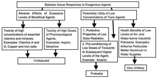 This report initially discusses the biphasic responses within cells, either to intrinsic constituents or to nutritional and lifestyle factors. It then proceeds with evaluation of the effects of low levels of radioactivity. Potential hormetic responses following exposure to such radiation has been widely reported. Radiation is the most studied exogenous factor that is undoubtedly harmful at high levels but which may have protective properties at lower levels. The final section concerns the relevance of hormetic events that are likely to have positive qualities, to chronic exposures to industrial pollutants. This extrapolation has been used in order to justify several types of low-level environmental contamination. The hazards of using hormetic phenomena in order to validate atmospheric or water-borne pollution are described. The directions followed by this overview are summarized in Figure 1.