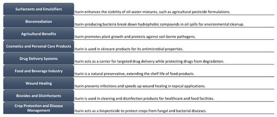 Iturin A exhibits emulsifying properties, facilitating the dispersion and stabilization of oil droplets in a water phase or vice versa. The substance is capable of arranging itself into either a monolayer or a bilayer when positioned at the boundary between two phases. This arrangement serves to decrease the tension at the interface and hinder the merging or separation of the liquids that are not mutually soluble [100]. The versatile nature of iturin A renders it advantageous for application in diverse sectors, including but not limited to food, pharmaceuticals, cosmetics, and agriculture, wherein emulsions are frequently employed. Iturin A has been found to provide potential benefits in various applications, including medication delivery. Specifically, it has demonstrated the ability to enhance the solubility and bioavailability of medicines that exhibit low solubility [101]. Iturin-derived surfactants are utilized in several industries, including cosmetics, detergents, and oil recovery, where the presence of surface-active agents is necessary.
