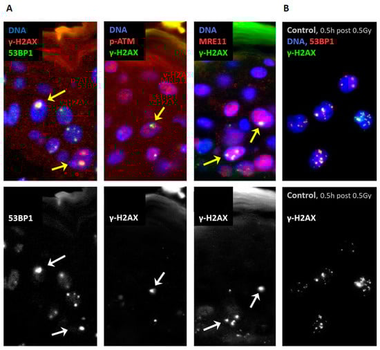 (A) Wide-field fluorescence images of paraffin sections of minipig skin stained for persistent nuclear (DAPI, blue) foci (arrowed) displaying the DSB damage markers 53BP1, MRE11, pATM (detected with Cy3, red) and co-stained for γ-H2AX (Alexa488, green; for color coding see upper left corner of the image details). The keratin layer of the skin (orange/green) is situated at the top of the image details. Persistent foci are absent from non-irradiated skin (see Figure 2 in ref. []). (B) Image of control LCL cells 30 min after 0.5 Gy X irradiation displaying colocalizing foci for γ-H2AX and 53BP1. Grayscale images in the lower row show the green γ-H2AX channel of the RGB figure for better color discrimination.