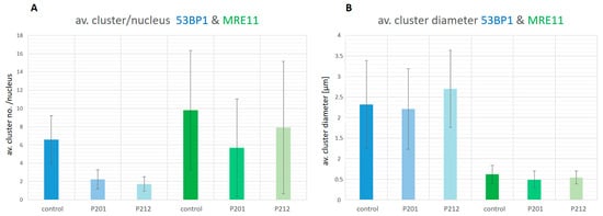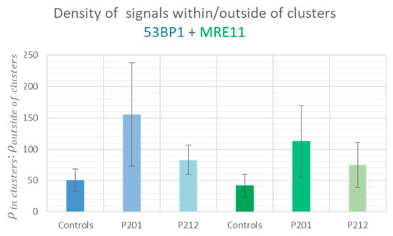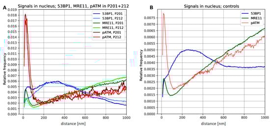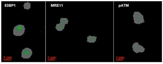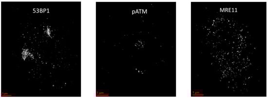 The results described above indicate a preferential accumulation of the analyzed DDR proteins within the γ-H2AX-outlined macro-foci, which is typical for ongoing repair; 53BP1 overlaps the γ-H2AX ROIs, while small clusters of MRE11 and pATM are integrated into the γ-H2AX-tagged chromatin regions. This was also seen in DSB regions of LCL control nuclei 30 min after irradiation and is in agreement with results obtained in other cell types (see, e.g., [,,,]).
